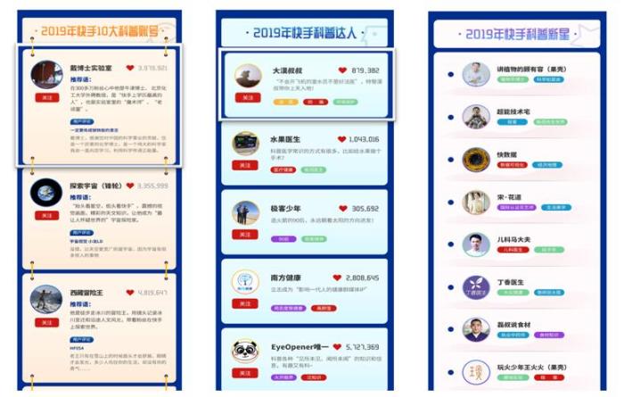近日,快手教育生態聯合科普中國發布2019年度科普領域榜單,公布“十大科普號”“科普達人榜”“科普新星榜”等細分榜單。