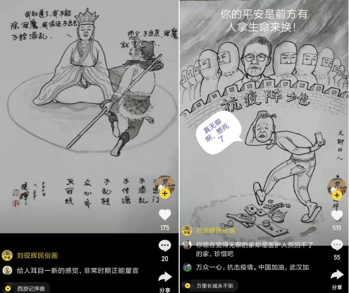 民俗畫家、漫畫家“劉現輝民俗畫”(ID:liuxianhui999)通過漫畫的形式宣傳抗疫。他上傳的動畫版作品顯示,孫悟空手拿金箍棒為師傅唐僧畫了一個安全的圈,叮囑師父不要出來,“不出來,冠魔就害不了你”。唐僧回答道:“我知道了,我不能除冠魔,我保證不出去,不給添亂。”漫畫下方,還有劉現輝題寫的三字口訣:不出門,不添亂、不傳謠、不亂轉、眾心齊、滅冠妖。動畫帶配音,耳目一新。