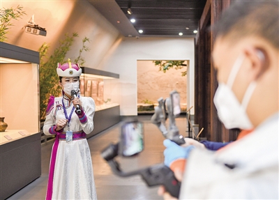 2020年3月7日,內蒙古呼和浩特市昭君博物院金牌講解員在進行5G文旅直播,讓公眾足不出戶感受“單于和親”“昭君出塞”的歷史文化魅力。丁根厚攝/光明圖片