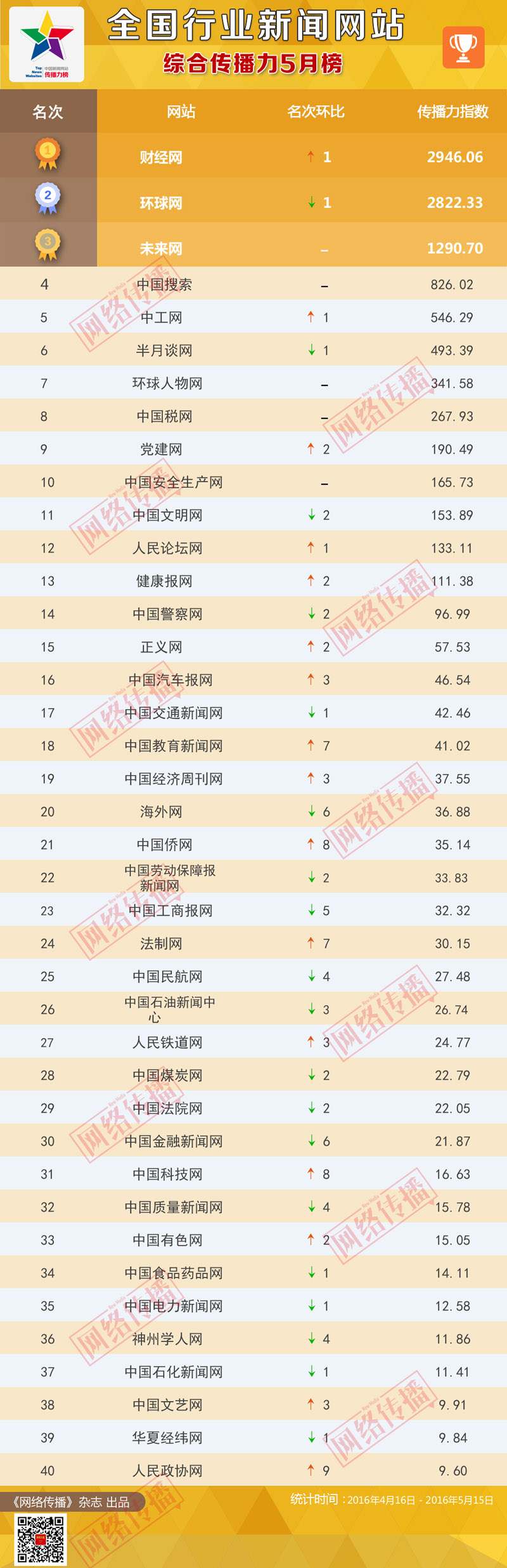中央網信辦《網絡傳播》雜志傾力打造的“全國行業新聞網站傳播力2016年5月榜”今日正式發布。榜單顯示,財經網、環球網、未來網穩坐綜合傳播力榜和PC端傳播力榜前三把交椅,兩微傳播力榜前三名是環球網、半月談網、財經網。