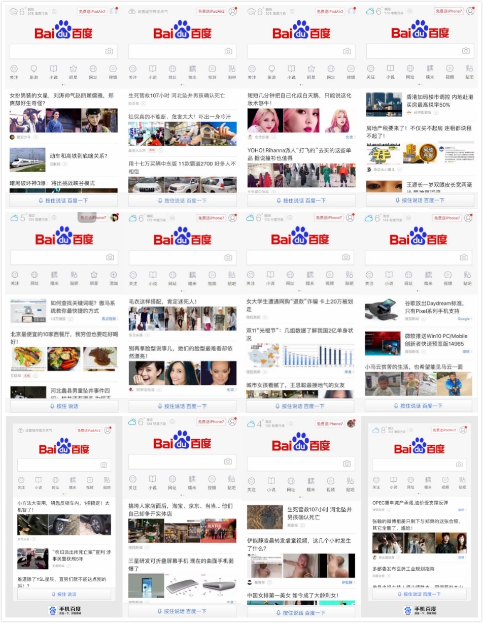 歷時三個小時,三路記者累計收集了309張路人的手機(jī)百度資訊流截圖,從截圖來看,記者確實找不到完全相同的兩個手機(jī)百度資訊流。但是當(dāng)記者進(jìn)行了一番數(shù)據(jù)統(tǒng)計之后,也發(fā)現(xiàn)了一些有趣的共性和更多的個性。