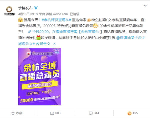 4月18日, @余杭發布 正式發布預告,表示將于18日晚20:00,在淘寶直播為余杭帶貨。