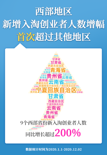 淘寶最新數(shù)據(jù)顯示,今年西部地區(qū)新入淘創(chuàng)業(yè)者人數(shù)增幅首次超越其他地區(qū),領跑全國。