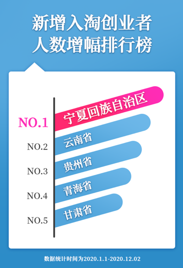 截至12月2日,今年入淘創(chuàng)業(yè)者同比增幅排名中,西部省(自治區(qū)、直轄市)在前10名中占據(jù)9席,且增速全部超過200%。其中,寧夏、云南、貴州、青海和甘肅位列前五。服飾、生鮮和百貨是西部淘寶商家最喜歡的三個創(chuàng)業(yè)領域。