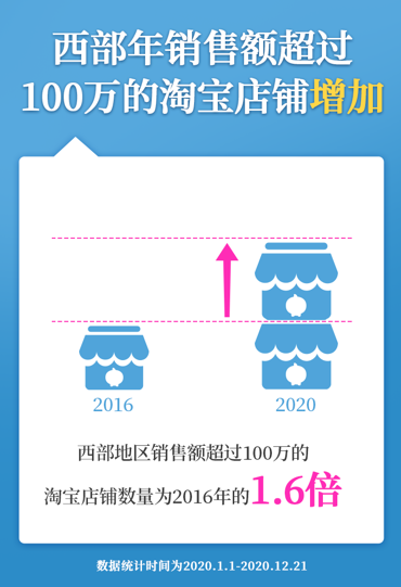 除了數(shù)量增加,西部地區(qū)在電商領域也迎來高質量發(fā)展。淘寶方面介紹,2016年至今,西部地區(qū)皇冠及以上的淘寶店鋪數(shù)量增長了109%;年銷售額超過100萬的商家數(shù)量也達到了5年前的1.6倍。