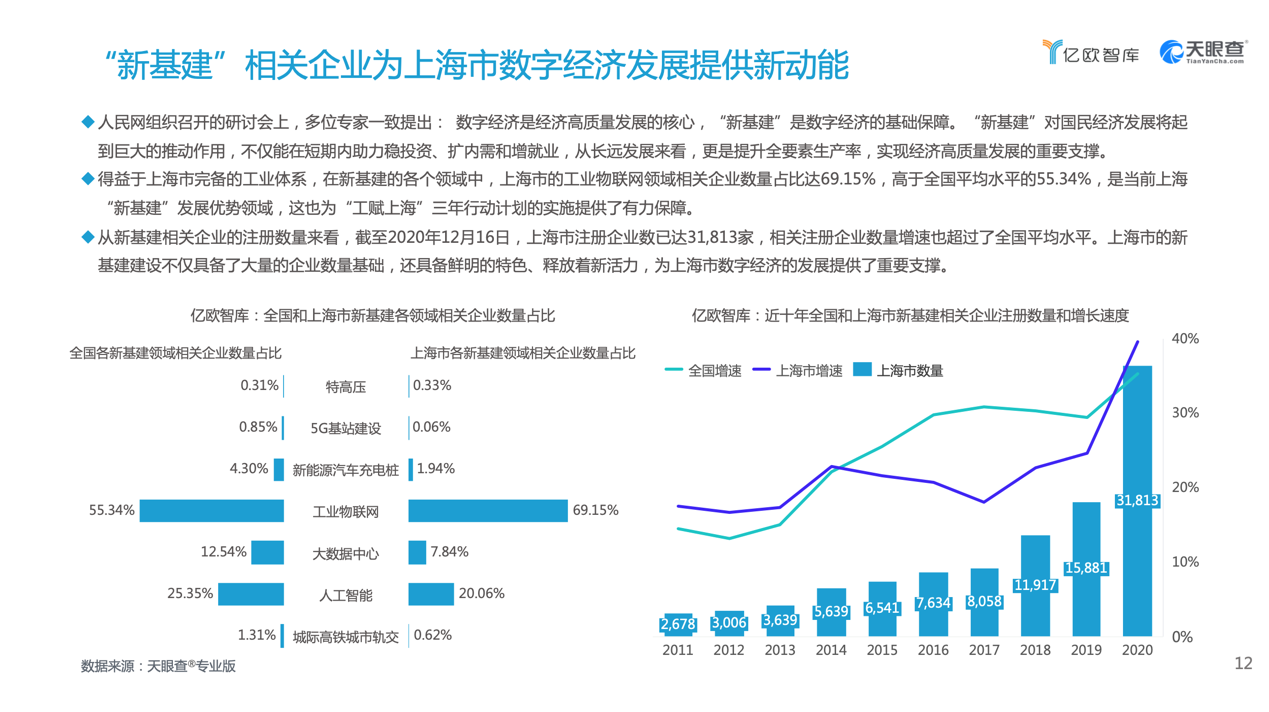 從新基建相關企業的注冊數量來看,截至20201216日,上海注冊企業數已達31,813家,相關注冊企業數量增速也超過全國平均水平。上海新基建建設不僅具備了大量的企業數量基礎,還具備鮮明特色、釋放新活力,為上海數字經濟發展提供了重要支撐。
