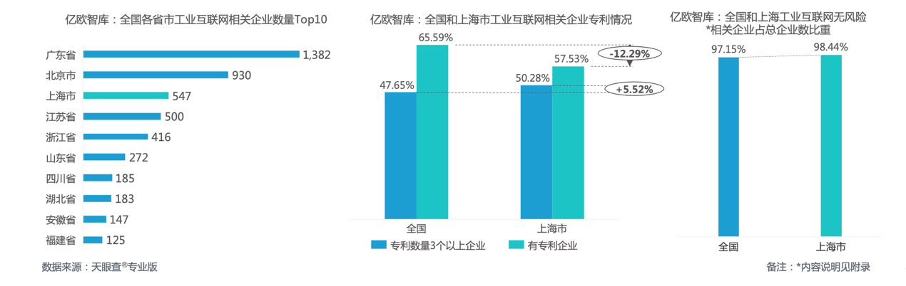 工業互聯網,是第二產業數字化代表行業。據天眼查數據顯示,上海市工業互聯網相關企業547家,位居全國第三,擁有3個及以上專利企業占比50.28%,高于全國水平;無風險企業占比98.44%,基本和全國持平,行業整體呈低風險狀態。