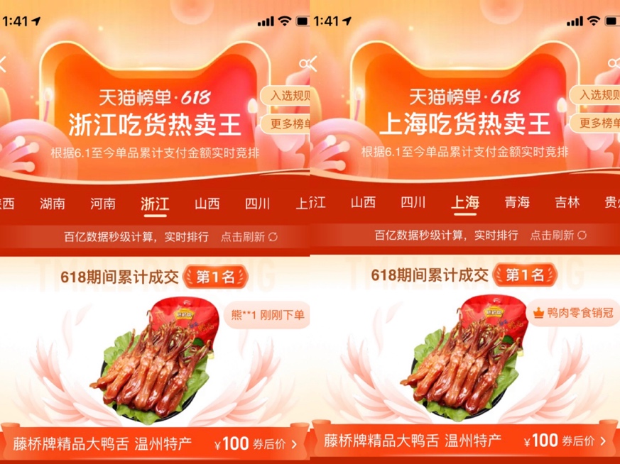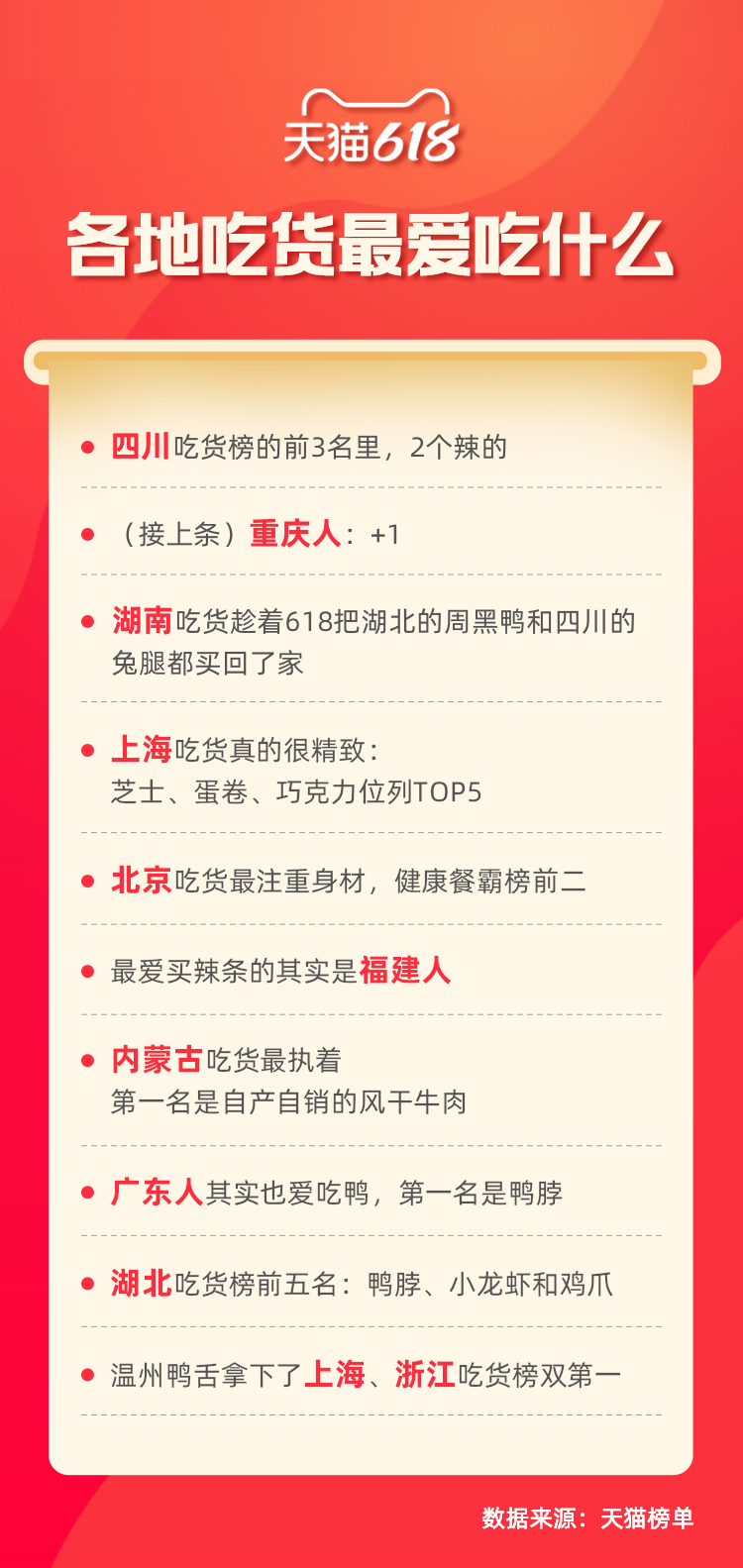 美食交流成為今年618各地熱賣榜的一個特點。湖南湖北的美食交流尤為熱烈,湖南吃貨趁著618把湖北周黑鴨和四川兔腿都買回了家;溫州鴨舌拿下了浙江、上海兩地吃貨榜第一名;內蒙古吃貨則表示,最愛的還是自己家的風干牛肉。