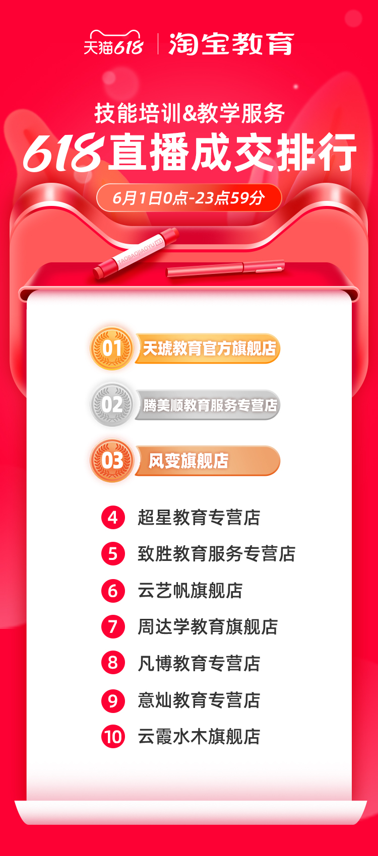 6 月 20 日,天貓 618 正式收官,教育品牌最后階段迎來集體爆發(fā),超過 20 家教育類天貓店日環(huán)比成交增幅超過 1000%,其中,天琥天貓旗艦店累積成交額同比去年整體增長 4741%。