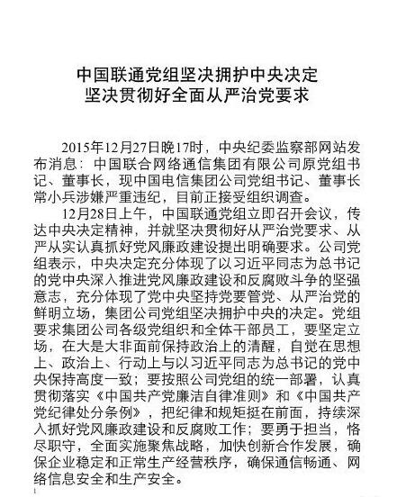 12月27日下午17點,中紀委在官網宣布“中國聯合網絡通信集團有限公司原黨組書記、董事長,現中國電信集團公司黨組書記、董事長常小兵涉嫌嚴重違紀,目前正接受組織調查。”隨后中國電信就此發表聲明,表示堅決支持中央的決定,堅決抓好黨風廉政建設。現在中國聯通也就此事發布聲明。