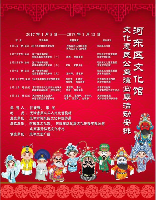 由天津市河東區文化和旅游局主辦,河東區文化館、天津騰達兄弟文化傳播有限公司、北京集賢弘藝文化中心承辦,天津文藝廣播協辦的河東區文化館2017年文化惠民公益演出季將于2017年元月拉開大幕,各路戲曲、曲藝名家齊聚河東,為百姓送上7場精彩紛呈的文化惠民公益演出。12月29日9:00,市民可持身份證前往第二工人文化宮劇場、天津市群眾藝術館一樓免費領票,數量有限,先到先得。
