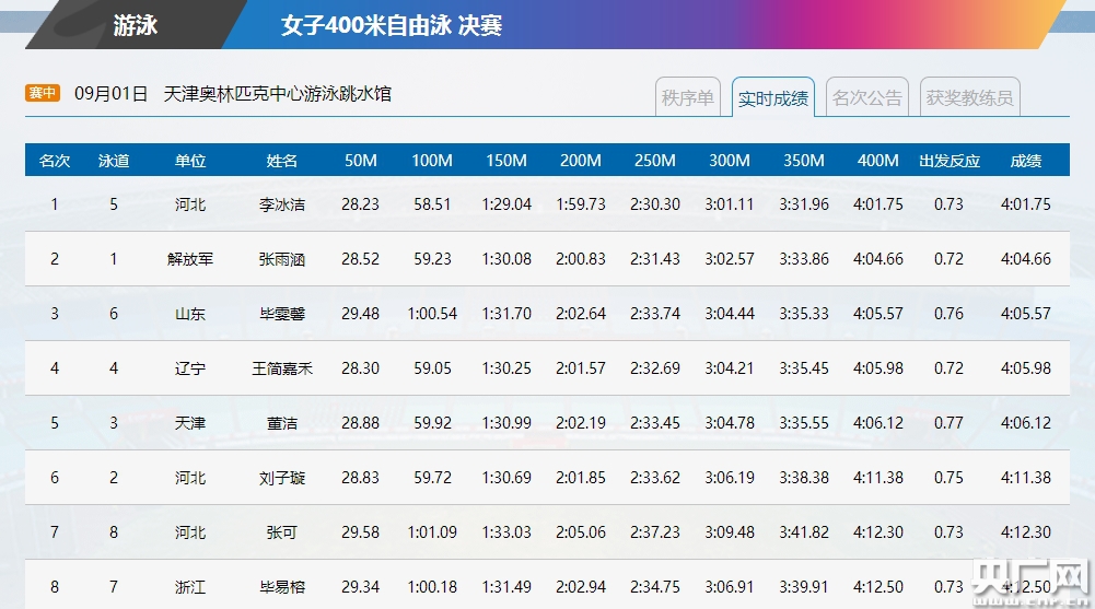 1日,第十三屆全運會游泳項目進入第二個比賽日,在女子400米自由泳決賽中,來自河北的15歲小將李冰潔以4:01.75獲得冠軍。解放軍張雨涵以4:04.66獲得亞軍,山東選手畢雯馨以4:05.57獲得季軍。