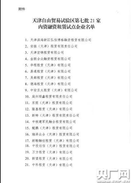 央廣網(wǎng)天津11月17日消息(記者夏震宇 蘇平)近日,天津自貿(mào)試驗(yàn)區(qū)第七批內(nèi)資融資租賃試點(diǎn)21家企業(yè)獲得確認(rèn),東疆保稅港區(qū)有19家企業(yè)上榜。至此,東疆內(nèi)資融資租賃企業(yè)已擴(kuò)軍至57家。