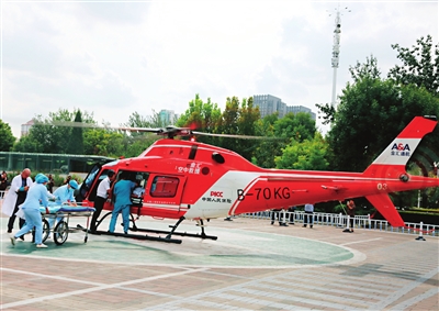 昨天上午,天津市人民醫(yī)院急診大樓門前,上演了一幕真實(shí)版的直升機(jī)救援“大片”。上午10點(diǎn)17分,一架印有PICC字樣的橘色直升機(jī)在眾人的驚呼和抓拍中,輕盈地降落在樓前空地上。但見(jiàn)幾名隨機(jī)醫(yī)護(hù)人員迅速?gòu)闹鄙龣C(jī)上轉(zhuǎn)移一副帶有患者的擔(dān)架,正在值班的醫(yī)務(wù)處王一穎大夫等幾位醫(yī)護(hù)人員快步上前接過(guò),一路小跑把患者推送至急診室。此次轉(zhuǎn)院救援服務(wù)是人保財(cái)險(xiǎn)天津市分公司直升機(jī)救援項(xiàng)目啟動(dòng)以來(lái)的首例救援行動(dòng),也是天津市第一起直升機(jī)救援案例,標(biāo)志著天津進(jìn)入空中救援新時(shí)代。