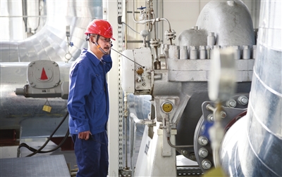 東北郊供熱管網一級中繼泵站工作人員每天都要傾聽供熱水泵中的軸承是否有雜音,以確保供熱水壓正常。 本報記者 張磊 攝