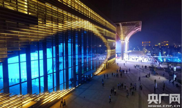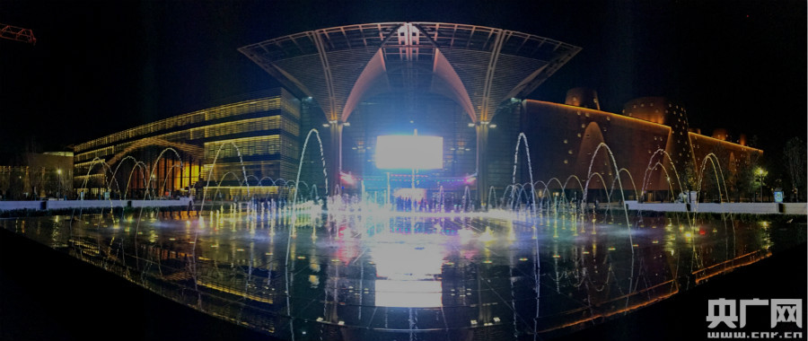 • 央廣網天津9月30日消息(記者 劉陽)天津濱海新區文化中心進入最后收尾,9月30日晚20點18分,文化中心開幕前整體燈光點亮,天津濱海中心圖書館、演藝中心、連廊、探索館瞬間點亮,前廣場噴泉也隨著音樂開始變換舞動,時而單柱擎天時而波浪連綿。現場有來自入駐商戶、工程代表、監理公司、物業公司等共計600人共同見證濱海新區點亮新未來。圖為天津濱海新區文化中心全景(劉陽/攝)
