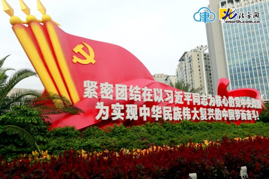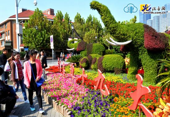 黨的十九大召開在即,天津各主干道路、繁華街區花團錦簇,一派祥和喜慶的氛圍。花卉景觀采用時令花草、綠植及草雕組合而成,結合十九大主題,構建了美麗的整體效果的景觀,不僅為扮靚了街景,更展現了全市人民對十九大即將召開的期盼。