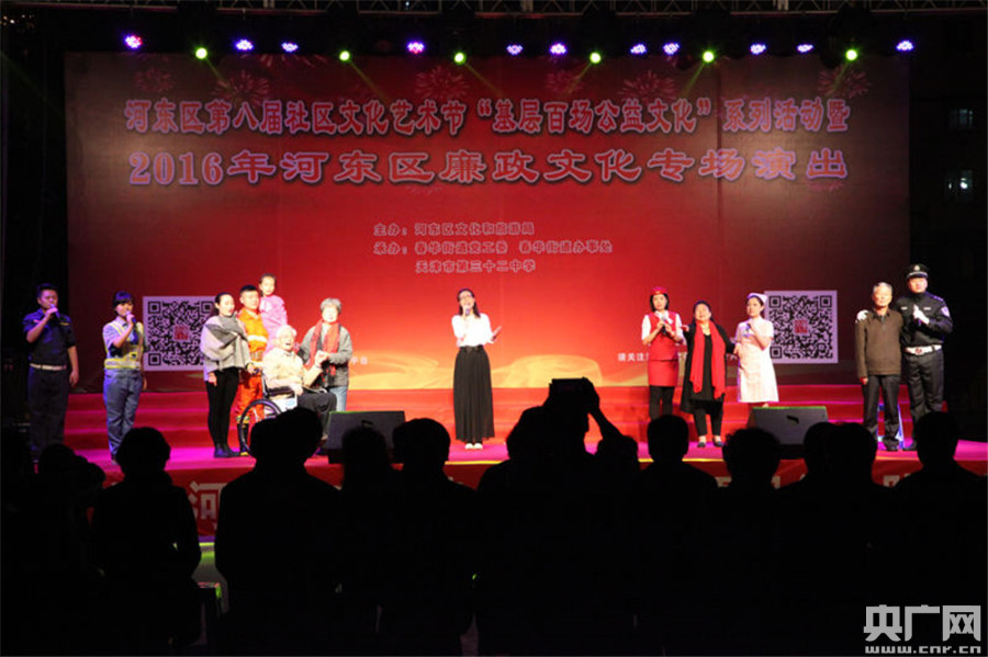 天津河東區第八屆社區文化藝術節“基層百場公益文化”系列活動昨(11日)晚在春華街道舉行2016年河東區廉政文化專場演出。河東區文化館業務干部、館辦團隊,社區文藝骨干,以及天津市公共文化志愿服務總隊的志愿者們為廣大群眾獻上了內容健康向上、弘揚社會正能量的節目,也展示了河東區廉政文化建設,讓群眾感受到河東區“家風正、民風淳、政風清”的良好社會氛圍。