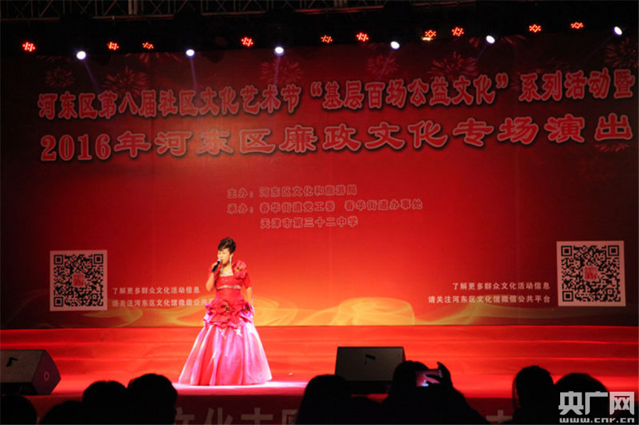 央廣網天津1012日消息(記者賈立梁)天津河東區第八屆社區文化藝術節“基層百場公益文化”系列活動昨(11日)晚在春華街道舉行2016年河東區廉政文化專場演出。河東區文化館業務干部、館辦團隊,社區文藝骨干,以及天津市公共文化志愿服務總隊的志愿者們為廣大群眾獻上了內容健康向上、弘揚社會正能量的節目,也展示了河東區廉政文化建設,讓群眾感受到河東區“家風正、民風淳、政風清”的良好社會氛圍。