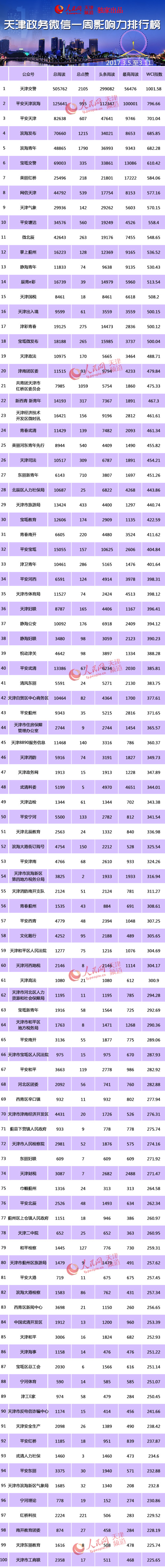 本期排行榜中,前十名的政務類微信公眾號依次為“天津交警”、“平安天津濱海”、“平安天津”、“濱海發布”、“濱海青年”、“寶坻交警”、“美麗紅橋”、“網信天津”、“天津氣象”、“平安塘沽”。