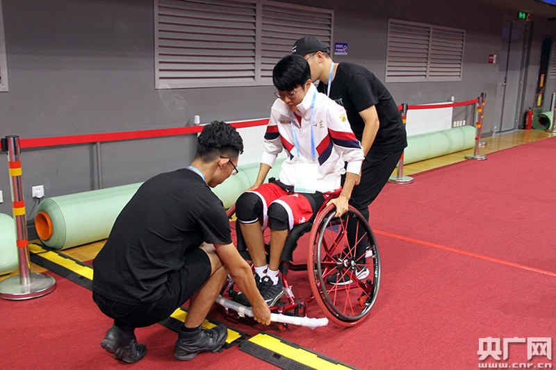 志愿者服務輪椅籃球運動員(央廣網發 天津城建大學供圖)