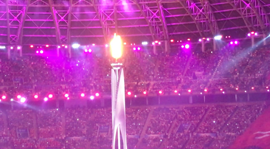 在火炬傳遞環節,首創將場內火炬傳遞延伸進觀眾席,火炬所到之處,激發觀眾手中紅色發光物燃亮,以“火光帶動燈光”在視覺上形成燈火相映、光芒燃動的震撼效應。這是一次獨特的看臺景觀設計,造就了一次參與人數眾多的火炬傳遞,也體現了“全運惠民,健康中國”的主題,采取津娃與智能機器人攜手點燃圣火的方式,這是傳統與現代的碰撞、是文化與科技的交握,寓意天津對未來的邀約——以體育的名義,誠邀天下;以圣火的光芒,啟動未來。