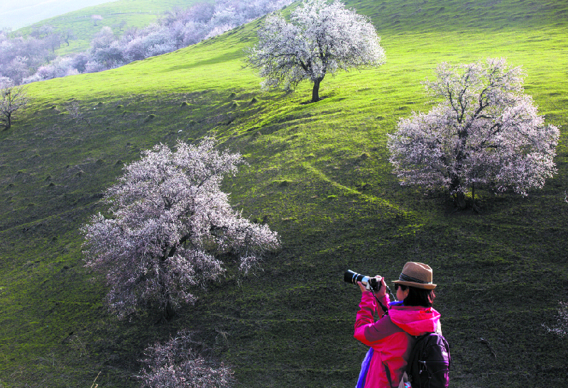 4月11日,游客在吐爾根鄉(xiāng)拍攝杏花。