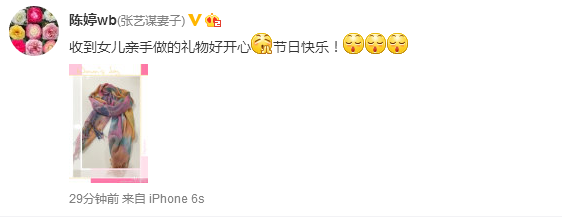 騰訊娛樂訊 今日(3月8日),張藝謀的妻子陳婷在微博曬出一條漂亮絲巾,并附言稱:“收到女兒親手做的禮物好開心,節(jié)日快樂!”網(wǎng)友紛紛送上祝福:“節(jié)日快樂!”、