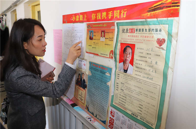 目前,劉花老人暫住在孫子家,家里的一面墻上貼著政府對劉花的幫助,包括貧困戶幫扶責任人聯系卡、健康扶貧家庭醫生簽約服務、住房安全等級明白卡、致貧困家庭的一封信等材料。