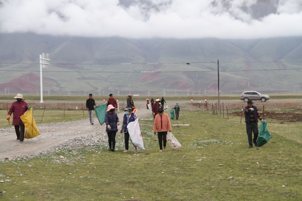 三江源國家公園治多生態(tài)環(huán)保協(xié)會的志愿者在撿拾垃圾(6月15日攝)。