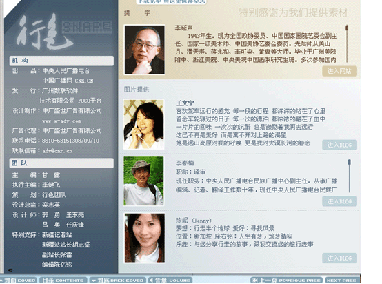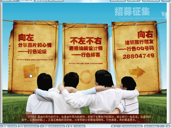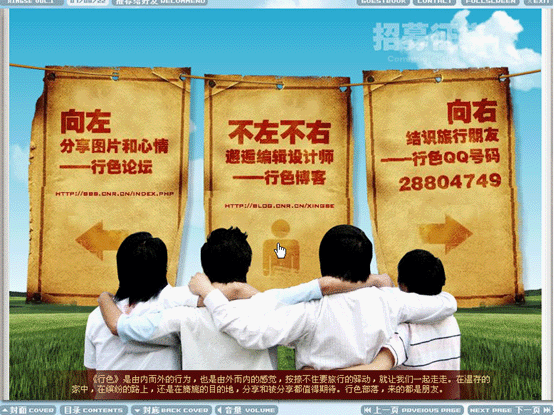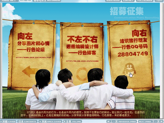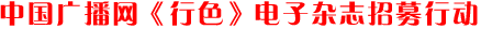 電子雜志是運用flash制作方式將音頻、視頻、圖片、文字及動畫等集成,通過多媒體形式呈現閱讀元素,并且通過網絡下載和在線閱讀,由于具有翻頁瀏覽功能,故名電子雜志。一本電子雜志小則幾兆,多則幾十或者上百兆,使用一般配置的計算機和寬帶網絡都能流暢下載和閱讀。一般電子雜志網站都提供客戶端訂閱器,供雜志的定期下載與訂閱,而訂閱器多采用流行的P2P技術來提高下載速度。作為web2.0的代表性應用之一,電子雜志有發行方便,發行量大,分眾傳播等特點。以下以中國廣播網《行色》電子雜志為例。