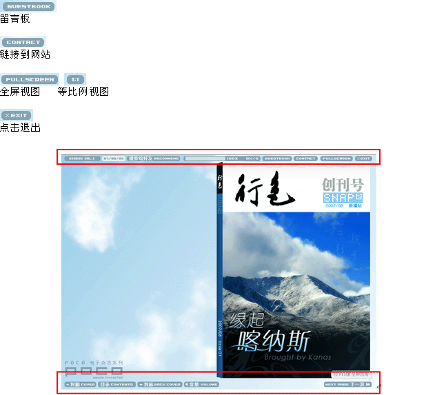 1、雜志的功能按鈕:分布在雜志頁面最上面和最下面的導航欄。