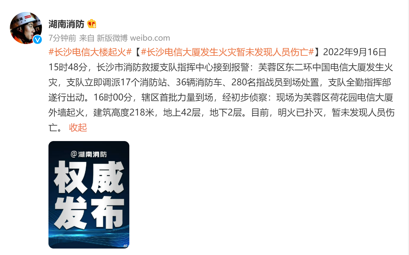湖南消防通報長沙電信大廈火災:暫未發現人員傷亡