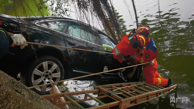廣東江門一小車沖破護欄懸掛湖邊,消防緊急救援