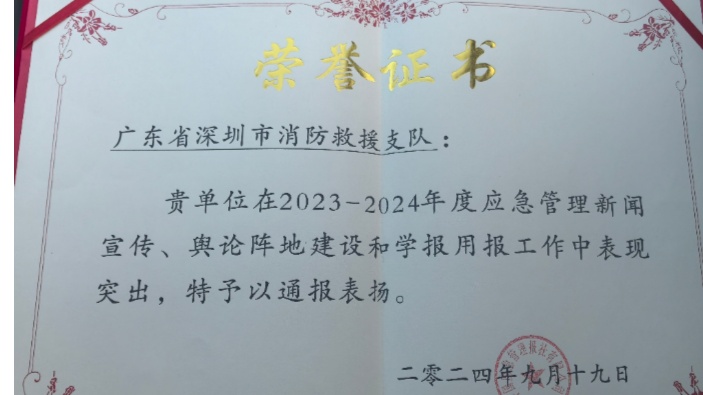深圳消防連續四年榮獲“全國應急管理新聞宣傳暨學報用報先進單位”稱號。