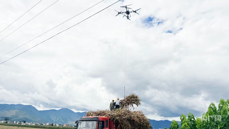 無人機(jī)在田間穿梭忙碌,一捆捆新鮮的青貯玉米被快速運(yùn)送至裝車點(diǎn)。