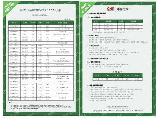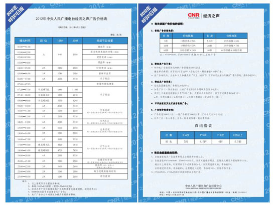 中央人民廣播電臺中國之聲、經(jīng)濟之聲廣告價格將于2012年8月21日起調(diào)整,調(diào)整后價格表已于日前正式發(fā)布。全權(quán)負責(zé)中國之聲、經(jīng)濟之聲廣告業(yè)務(wù)經(jīng)營的央廣廣告公司授權(quán)本網(wǎng)站獨家刊載,未經(jīng)授權(quán)請勿擅自刊登或轉(zhuǎn)載,否則將追究相關(guān)法律責(zé)任。