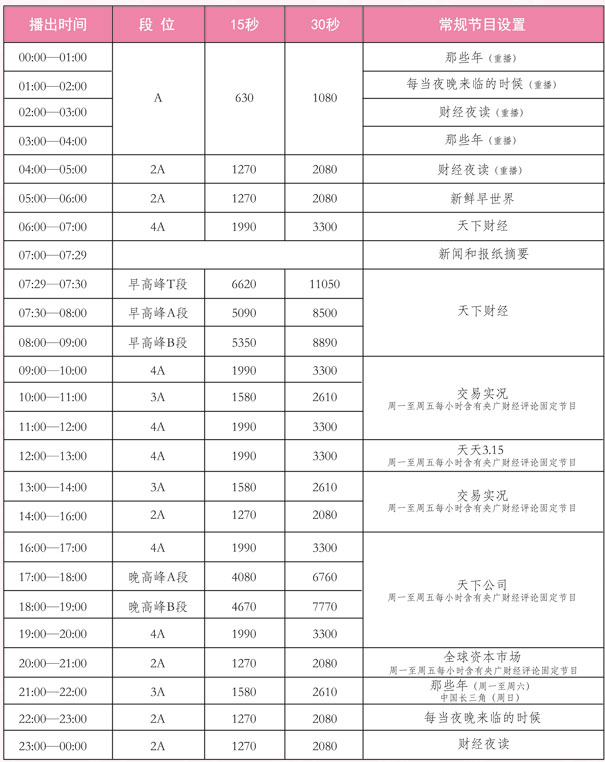 3、經(jīng)濟之聲廣告價格將根據(jù)廣告預售情況以及廣告時間飽和情況擇期調(diào)整,請及時關(guān)注;