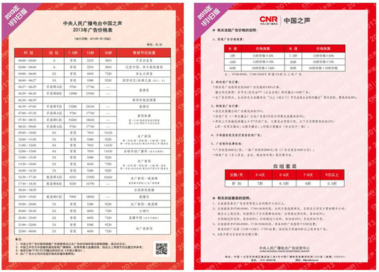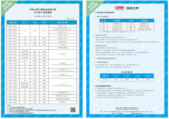 日前,2013年中央人民廣播電臺中國之聲、經濟之聲廣告價格表正式發布,全權負責經濟之聲廣告業務經營的央廣廣告公司授權本網站獨家刊載,未經授權請勿擅自轉載。