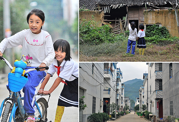左圖:在江西上饒縣寶山丁移民新村,姐姐毛淑婷(左)和妹妹毛小悅在小區里騎車玩耍;右上:姐妹倆在山中荒廢的土坯房前;右下:這是姐妹倆現在居住的上饒縣寶山丁移民新村(9月28日攝)(拼版照片)。