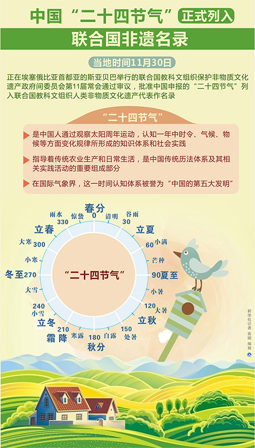 在埃塞俄比亞首都亞的斯亞貝巴舉行的聯合國教科文組織保護非物質文化遺產政府間委員會第11屆常會11月30日通過審議,批準中國申報的“二十四節氣”列入聯合國教科文組織人類非物質文化遺產代表作名錄。