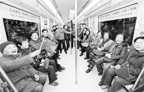 12月15日,安徽合肥軌道交通1號線列車車廂內,來自瑤海區勝利路街道一號線沿線搬遷居民在體驗軌道交通。當日,安徽首條地鐵線路——合肥軌道交通1號線啟動20萬人大型免費試乘體驗活動。這是一條縱貫合肥市南北的線路,將于12月26日正式開通運營。 張大崗攝