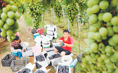 南康市三江鄉(xiāng)明輝葡萄基地主人陳春明(右)在收獲葡萄。宗家財 楊曉明攝