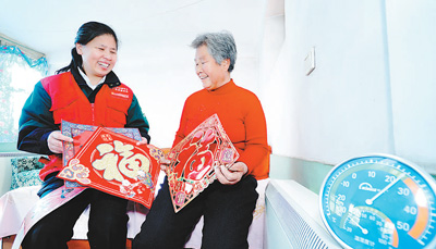 圖為供電公司服務隊隊員來到李淑英大媽(右)家里了解用電情況。