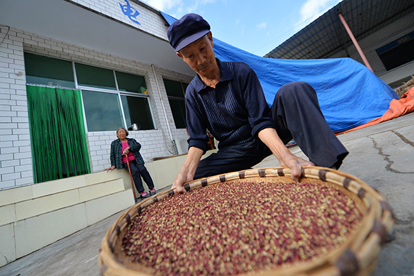 甘肅省隴南市武都區(qū)漢王鎮(zhèn)花椒種植戶楊云開在篩花椒,他的花椒將賣給當(dāng)?shù)匾患乙噪娚谭绞竭\營的花椒專業(yè)合作社(2015年10月10日攝)。