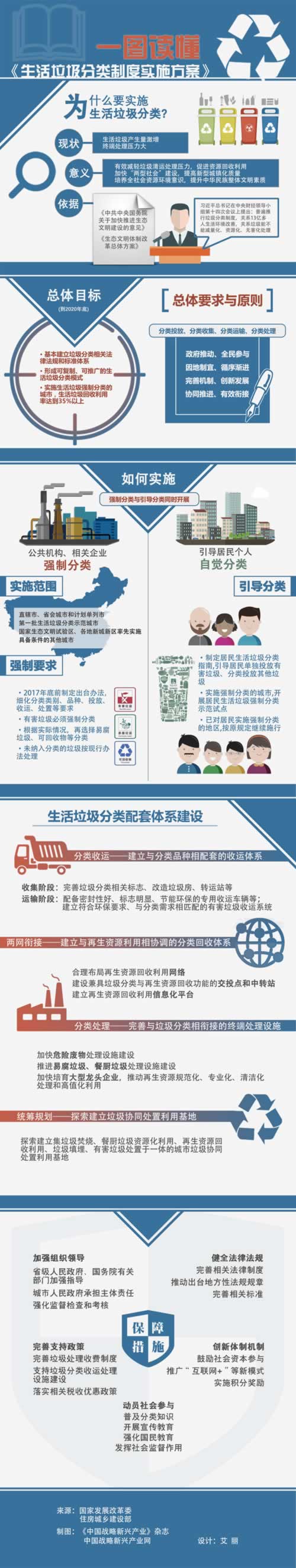 國務院辦公廳昨天發布關于轉發國家發展改革委、住房城鄉建設部《生活垃圾分類制度實施方案》的通知。《方案》制定了生活垃圾分類制度實施的目標、垃圾分類的類別、激勵機制等內容,46個城市將先行實施生活垃圾強制分類。