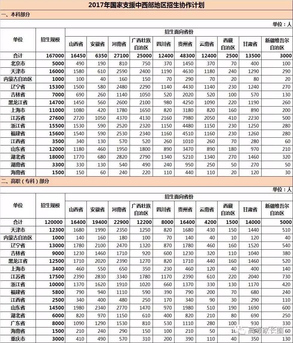 2017年,國家支援中西部地區招生協作計劃共安排28.7萬人,其中本科16.7萬人、專科12萬人,主要由公辦高校承擔。