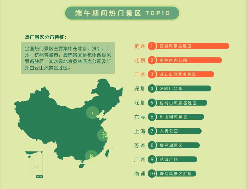 《指南》顯示,端午期間全國熱門景區主要集中在北京、深圳、廣州、杭州等城市。最熱景區是依舊是杭州西湖風景名勝區,其次是北京奧林匹克公園和廣州白云山風景名勝區。
