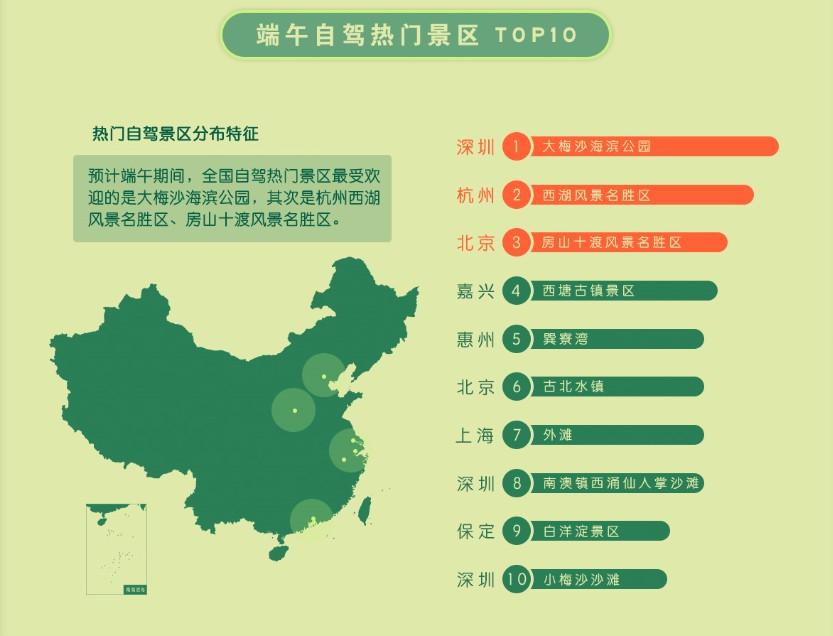 自駕游依然是端午小長假群眾熱衷的出行方式。根據高德地圖旅游大數據預測,端午期間,全國自駕游最熱門的景區是大梅沙海濱公園,其次是杭州西湖風景名勝區、房山十渡風景名勝區。