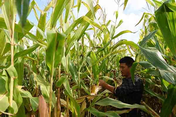 9月6日,黑龍江省富裕縣龍安橋鎮富欣村的種糧大戶袁鳳波在查看自家玉米受旱情影響情況。袁鳳波今年種植玉米約2000畝,他預計受旱情影響將減產約五成。